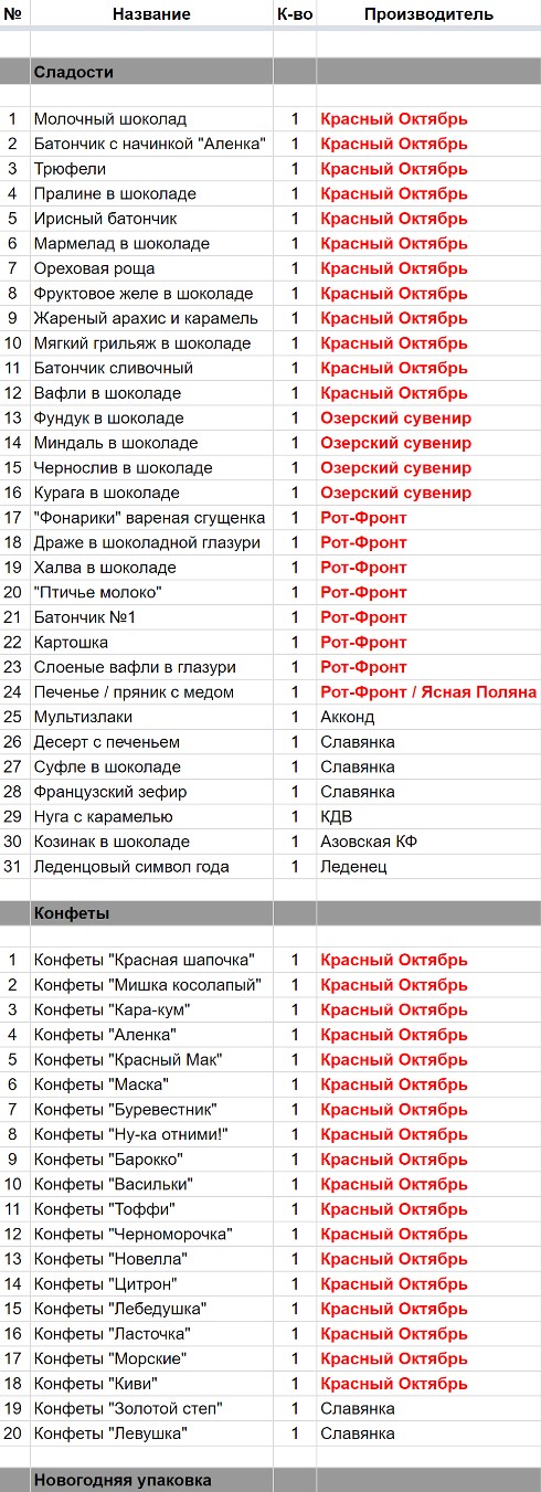 Молочный шоколад (1 шт), Батончик с начинкой "Аленка" (1 шт), Трюфели (1 шт), Пралине в шоколаде (1 шт), Ирисный батончик (1 шт), Мармелад в шоколаде (1 шт), Ореховая роща (1 шт), Фруктовое желе в шоколаде (1 шт), Жареный арахис и карамель (1 шт), Мягкий грильяж в шоколаде (1 шт), Батончик сливочный (1 шт), Вафли в шоколаде (1 шт), Конфеты "Красная шапочка" (1 шт), Конфеты "Мишка косолапый" (1 шт), Конфеты "Петушок" (1 шт), Конфеты "Кара-кум" (1 шт), Конфеты "Аленка" (1 шт), Конфеты "Красный Мак" (1 шт), Конфеты "Маска" (1 шт), Конфеты "Буревестник" (1 шт), Конфеты "Ну-ка отними!" (1 шт), Конфеты "Барокко" (1 шт), Конфеты "Васильки" (1 шт), Конфеты "Тоффи" (1 шт), Конфеты "Черноморочка" (1 шт), Конфеты "Цитрон"(1 шт), Конфеты "Лебедушка" (1 шт), Конфеты "Ласточка" (1 шт), Конфеты "Морские" (1 шт), Конфеты "Киви" (1 шт)