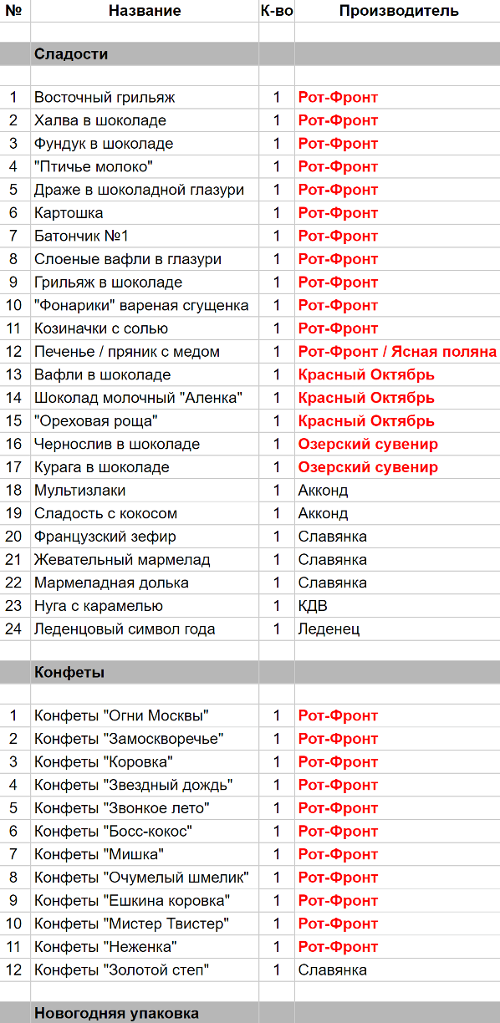 Восточный грильяж (1 шт), Халва в шоколаде (1 шт), Фундук в шоколаде (1 шт), "Птичье молоко" (1 шт), Драже в шоколадной глазури (1 шт), Картошка (1 шт), Батончик №1 (1 шт), Слоеные вафли в глазури (1 шт), Грильяж в шоколаде (1 шт), "Фонарики" вареная сгущенка (1 шт), Печенье / пряник с медом (1 шт), Конфеты "Огни Москвы" ,Конфеты "Замоскворечье" (1 шт), Конфеты "Вечерний звон" (1 шт), Конфеты "Коровка" (1 шт), Конфеты "Звездный дождь" (1 шт), Конфеты "Звонкое лето" (1 шт), Конфеты "Семейка сов" (1 шт), Конфеты  "Матрешка" (1 шт), Конфеты "Очумелый шмелик" (1 шт), Конфеты "Ешкина коровка" (1 шт), Конфеты "Мистер Твистер" (1 шт), Конфеты "Неженка" (1 шт)